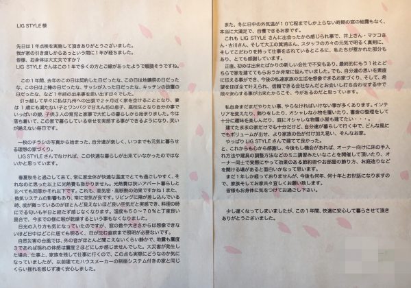 2018年3月にお引渡しさせていただいた、M様より、引き渡し後1年目のお手紙をいただきました。