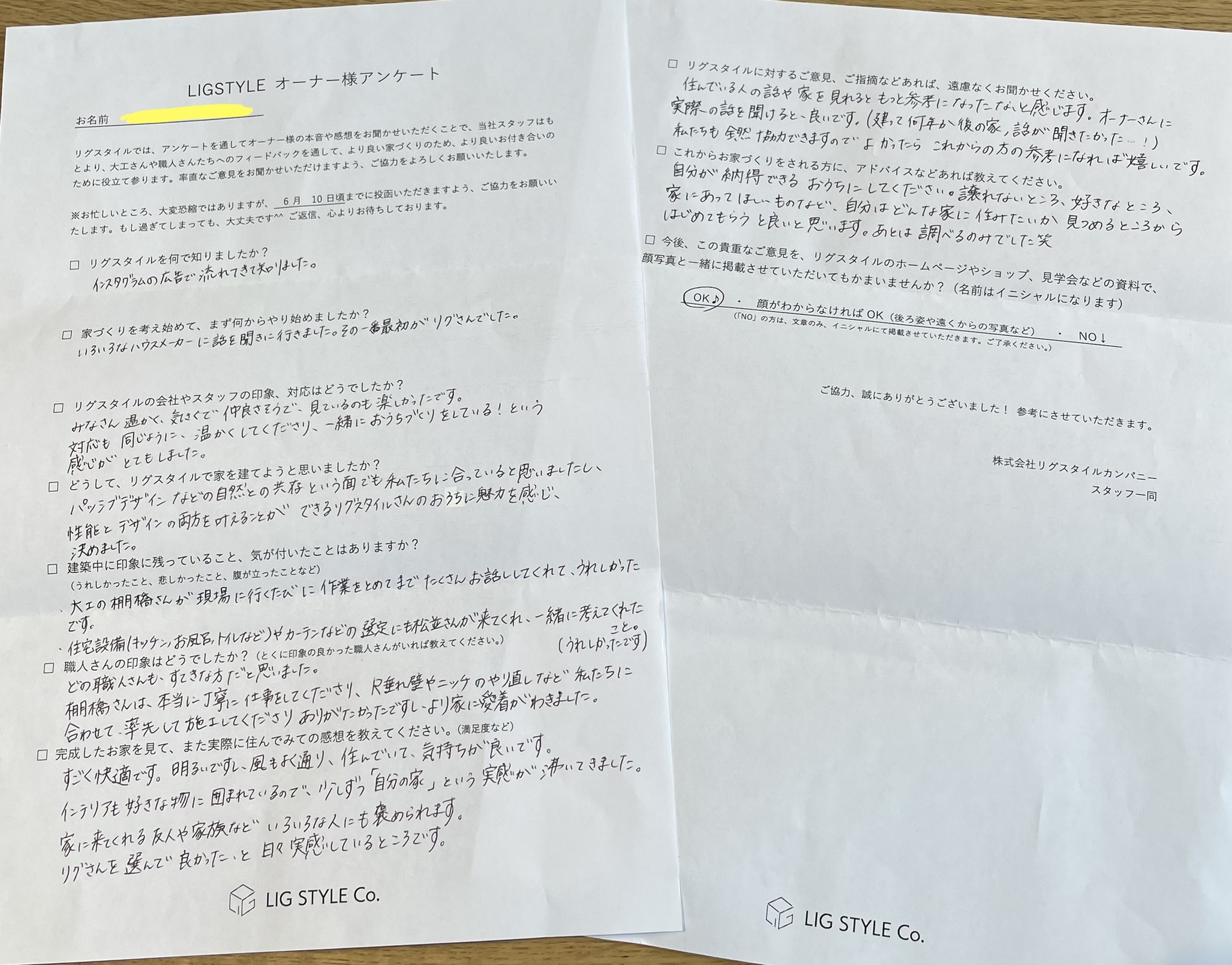 パッシブデザインなどの自然との共存という面でも私たちに合っていると思いましたし、性能とデザインの両方を叶えることができるリグスタイルさんのおうちに魅力を感じ、決めました。
